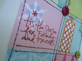 Nevertheless, I did get the stitching thing going, and made two Christmas "quilted" cards. The stamps are from Technique Tuesday, and all I did was I adhered the small square pieces onto the card and sewed it on. A card made in 5 minutes, and I love the look!